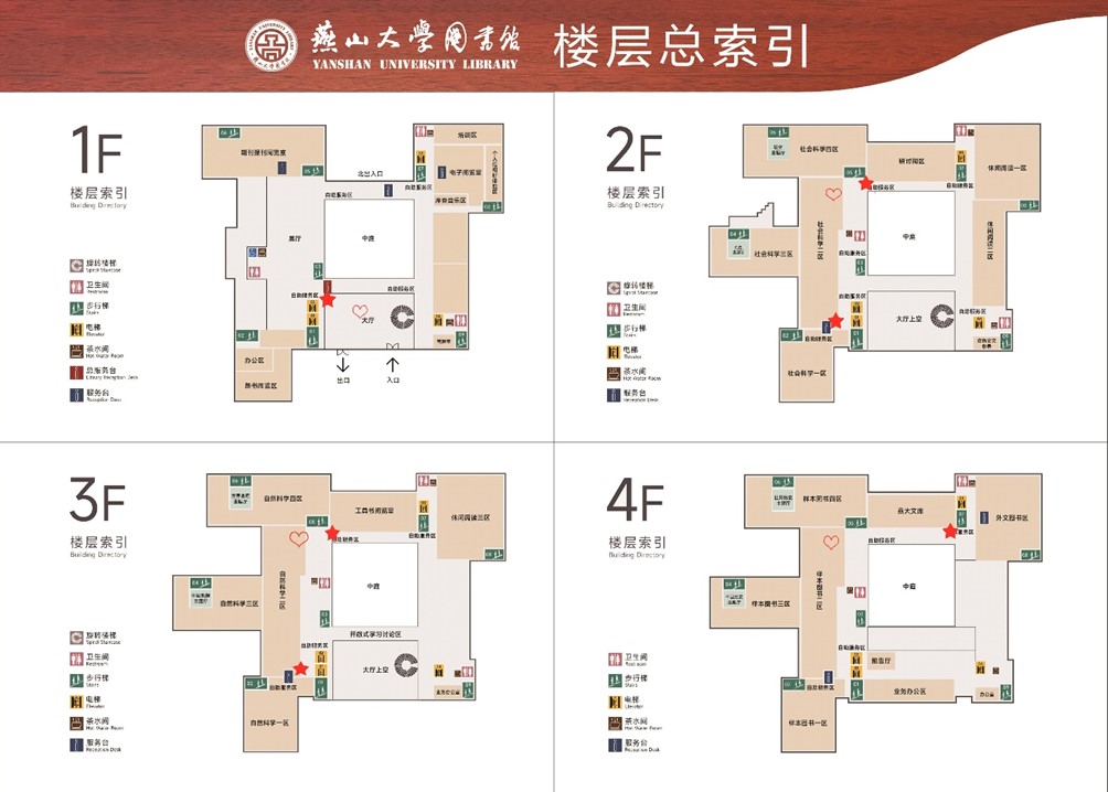 利用分布在各楼层的自助借还机实现自助借还书。(借还书过程中遇到问题可到各楼层服务台寻求人工帮助,或拨打电话0335-8605207。图中红色实心五角星处为自助借还机位置,红色空心心形为各楼层人工服务台)