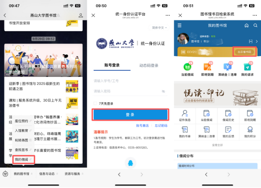 1.获取二维码:打开图书馆微信公众号“燕山大学图书馆“,进入“我的图书馆”→“我的借阅”生成个人借书二维码。第一次使用需要通过统一身份认证登录绑定工号/学号。