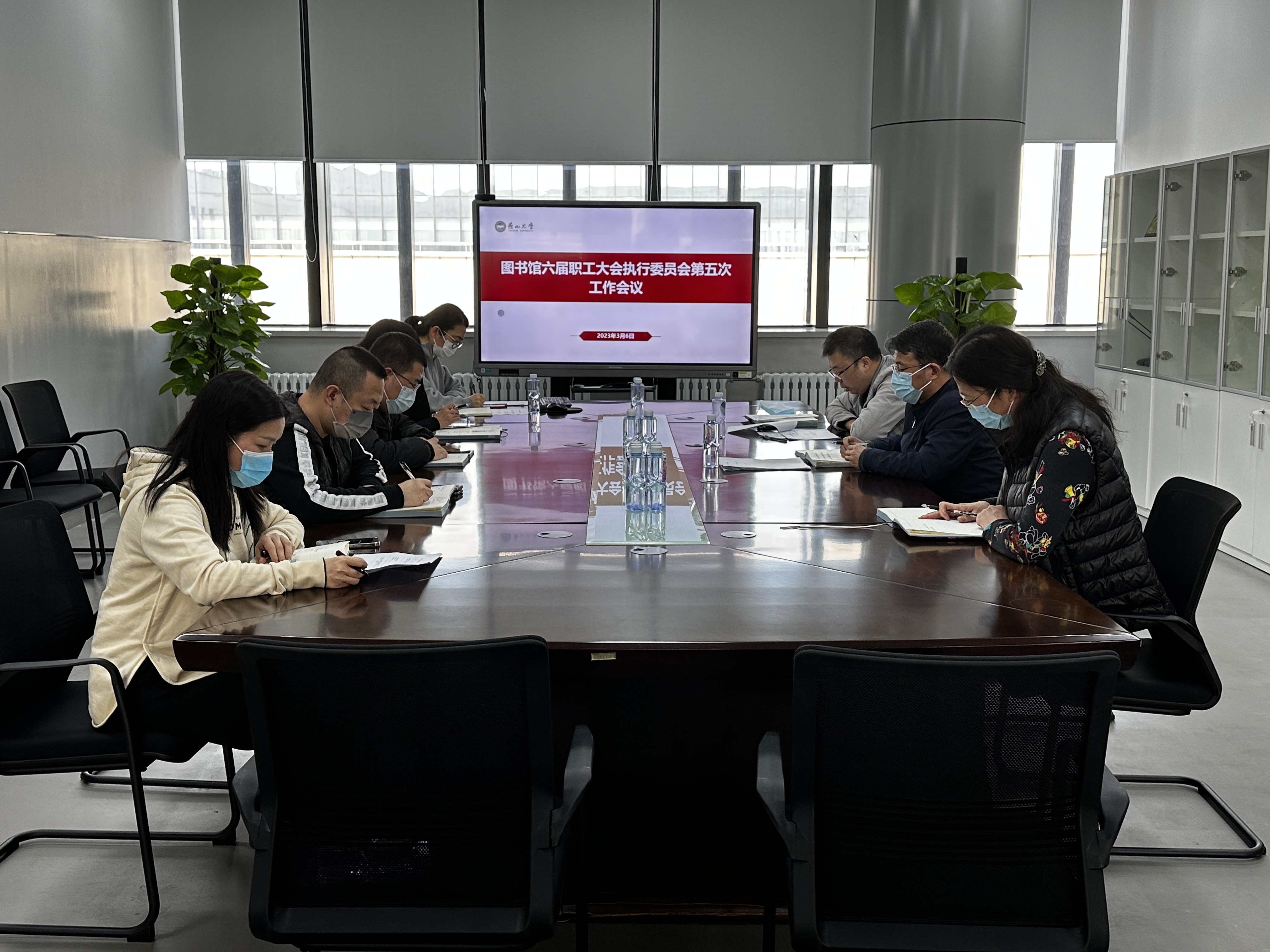3月6日上午,图书馆六届职工大会执行委员会第五次工作会议在四层党员活动室召开。图书馆六届执委会委员参加会议。会议由图书馆副馆长兼分工会主席王一淳主持。