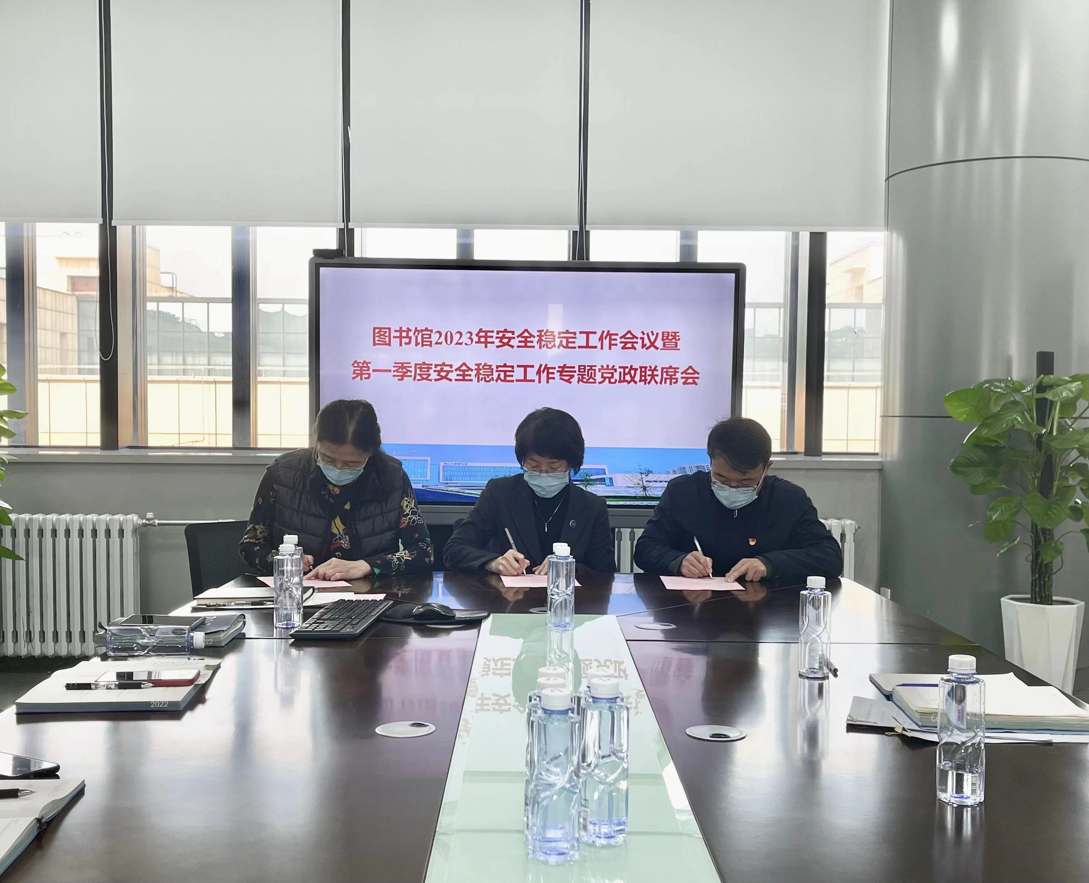 会上,屈晓阳、袁旭梅与各部室负责人签订了图书馆2023年安全稳定责任书。科级秘书谢姝琳对图书馆2022年安全稳定工作开展情况进行了总结汇报。