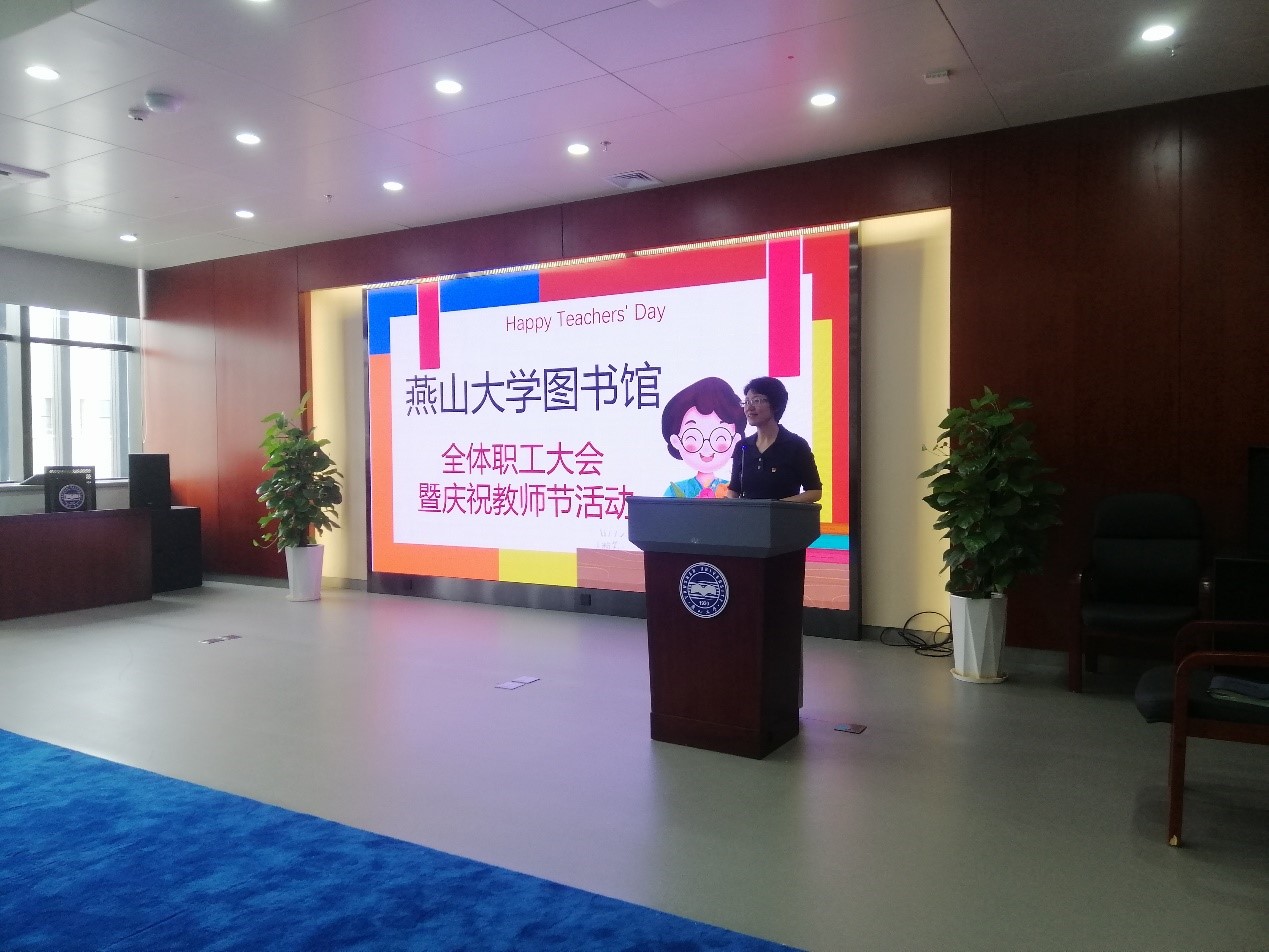 9月7日下午3点,庆祝活动在图书馆四楼报告厅准时开始。图书馆馆长兼党委书记袁旭梅致欢迎词,在庆祝教师节的同时也就近期馆内情况进行了介绍。