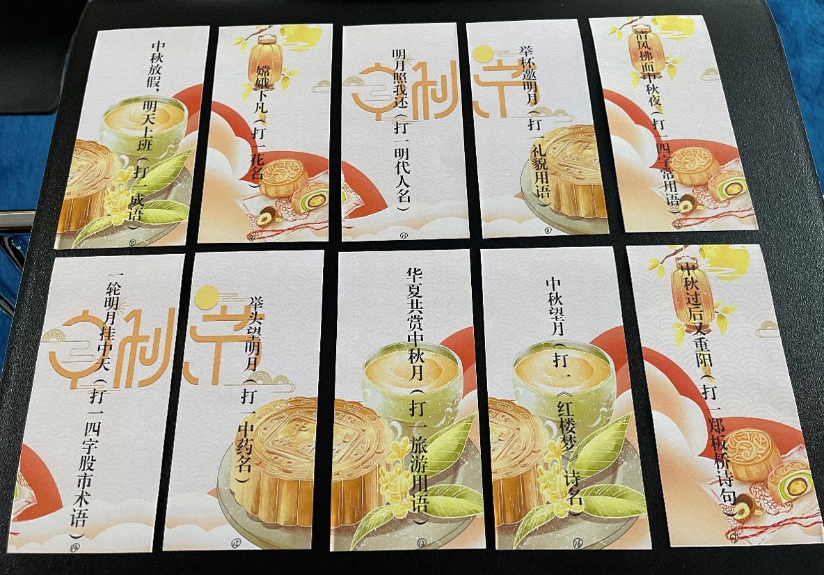 在品中秋之韵部分,大家除了品尝月饼、茶点、水果,回味乡愁的记忆,品尝丰收的甜蜜之外,活动还精心策划了寻宝-猜灯谜环节。现场的职工积极寻宝,开动脑筋猜灯谜,现场气氛融洽而热烈。