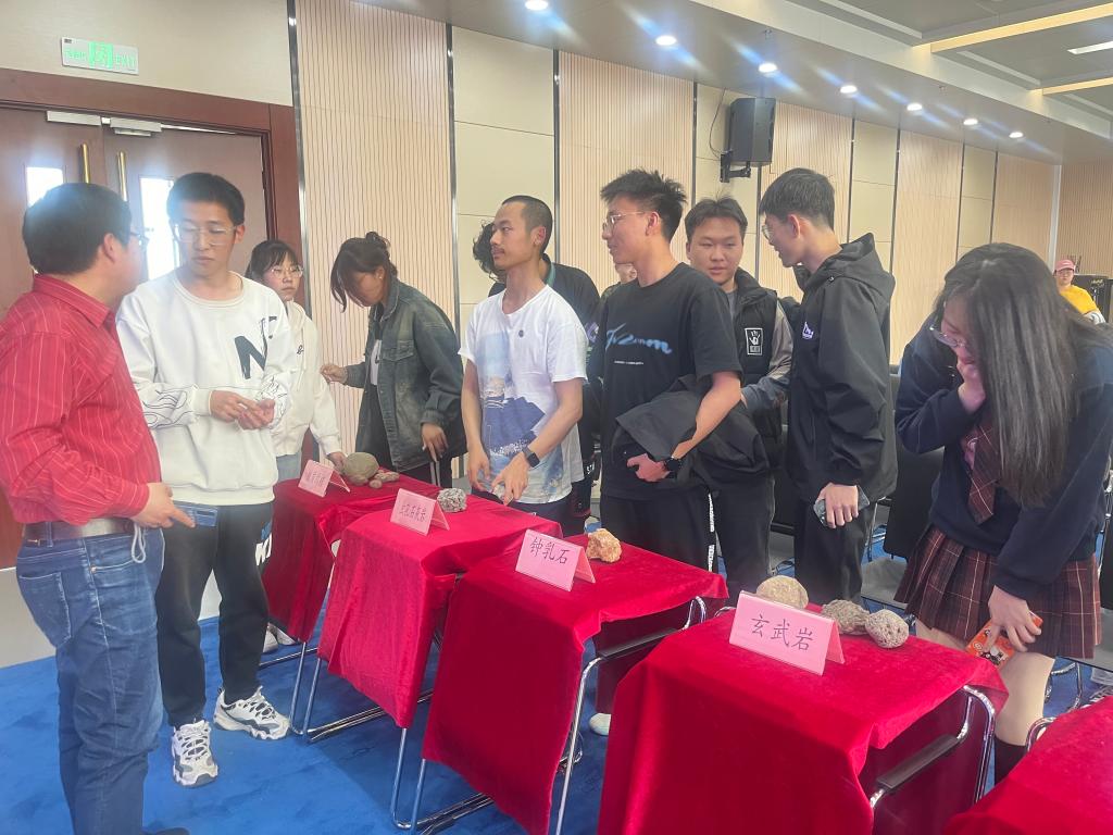 讲座最后,同学们近距离参观并触摸了各类岩石标本,提出了自己的疑惑,褚老师一一耐心解答。