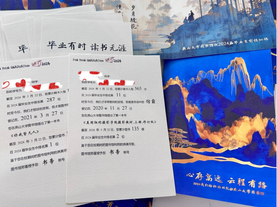 图书馆向即将离校的毕业生们赠送了毕业纪念折页。毕业纪念折页记录了毕业生个人入馆次数及排名、借阅次数及排名,以及根据大家入馆次数和借阅次数而授予的一个诙谐称号。毕业纪念折页既是图书馆送给毕业生的有纪念意义的礼物,也是图书馆对他们未来人生的美好寄语,愿燕山大学的毕业生们继续保持对知识的热爱和追求,牢记母校的教诲和嘱托,在以后的人生道路上始终坚持阅读,养成终身读书的好习惯,以更加饱满的热情和更加坚定的信念,迎接未来的挑战和机遇。