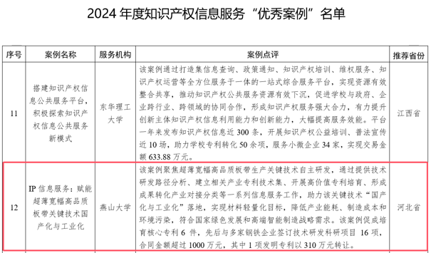 为充分发挥知识产权公共服务优秀实践的典型示范作用,总结和推广知识产权公共服务先进经验,国家知识产权局组织开展了案例征集和评选工作,近日,公布了《2024年度知识产权信息服务“十佳案例”和“优秀案例”》,我校图书馆(知识产权信息服务中心)报送的“IP信息服务:赋能超薄宽幅高品质板带关键技术国产化与工业化”案例,获评15个“优秀案例”之一,是继去年之后连续两年获评“优秀案例”,也是河北省唯一入选案例。
